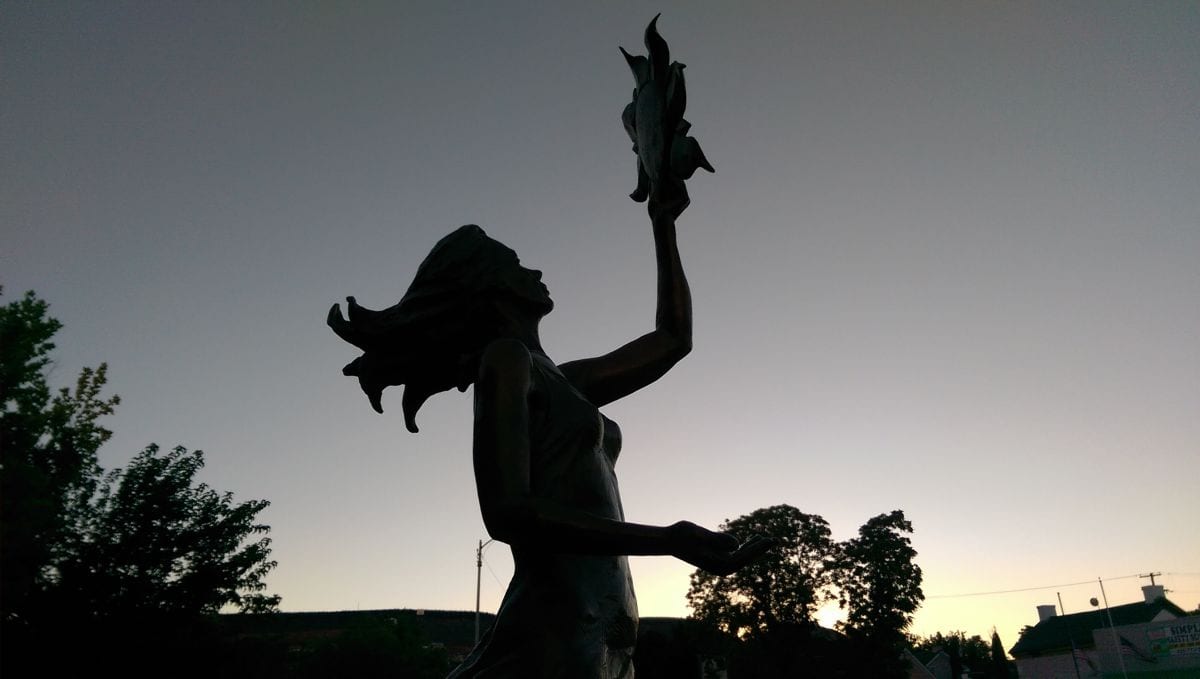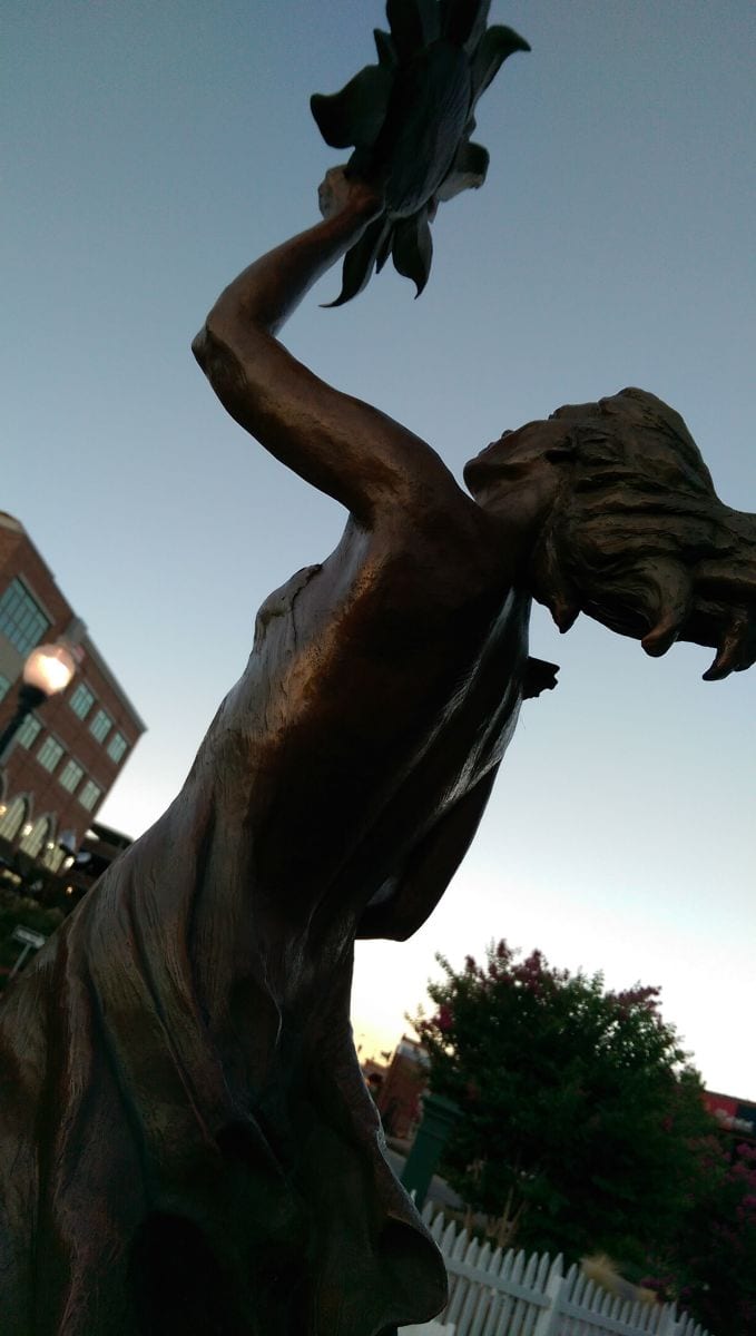 “Spirit of Energy,” a half-size bronze female figure designed as a fountain and created by Karen Crain, is one of this month’s Art Around the Corner featured pieces. She sculpted the figure to represent three natural renewable energy sources: sun, wind, and water. The figure holds the sun high above her head, the wind blows her hair and garment behind her, and water pours from her extended hand. Standing on a globe, as all humanity does, represents humankind’s responsibility to use the earth’s natural resources ethically.