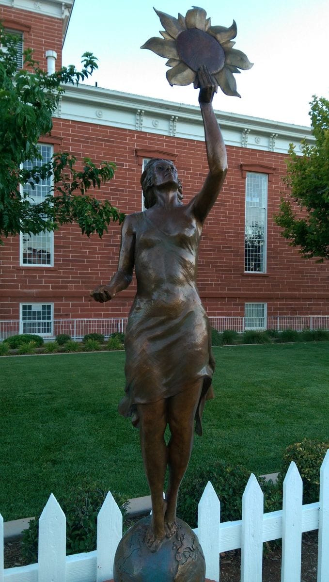 One might also find the woman to represent the source of life and the nurturing care of the earth, its resources, and humanity. This Art Around the Corner piece has been ideally placed just outside the beautiful flower garden on the corner of Tabernacle and Main, just across the street to the south of Annie’s Vintage Garden. Seeing the garden in full bloom throughout the season makes it easy to appreciate the gifts these resources can bestow. Not only does “Spirit of Energy” add beauty to the downtown Art Around the Corner exhibit, it adds intrigue, allowing for one to consider his or her own place and responsibility.